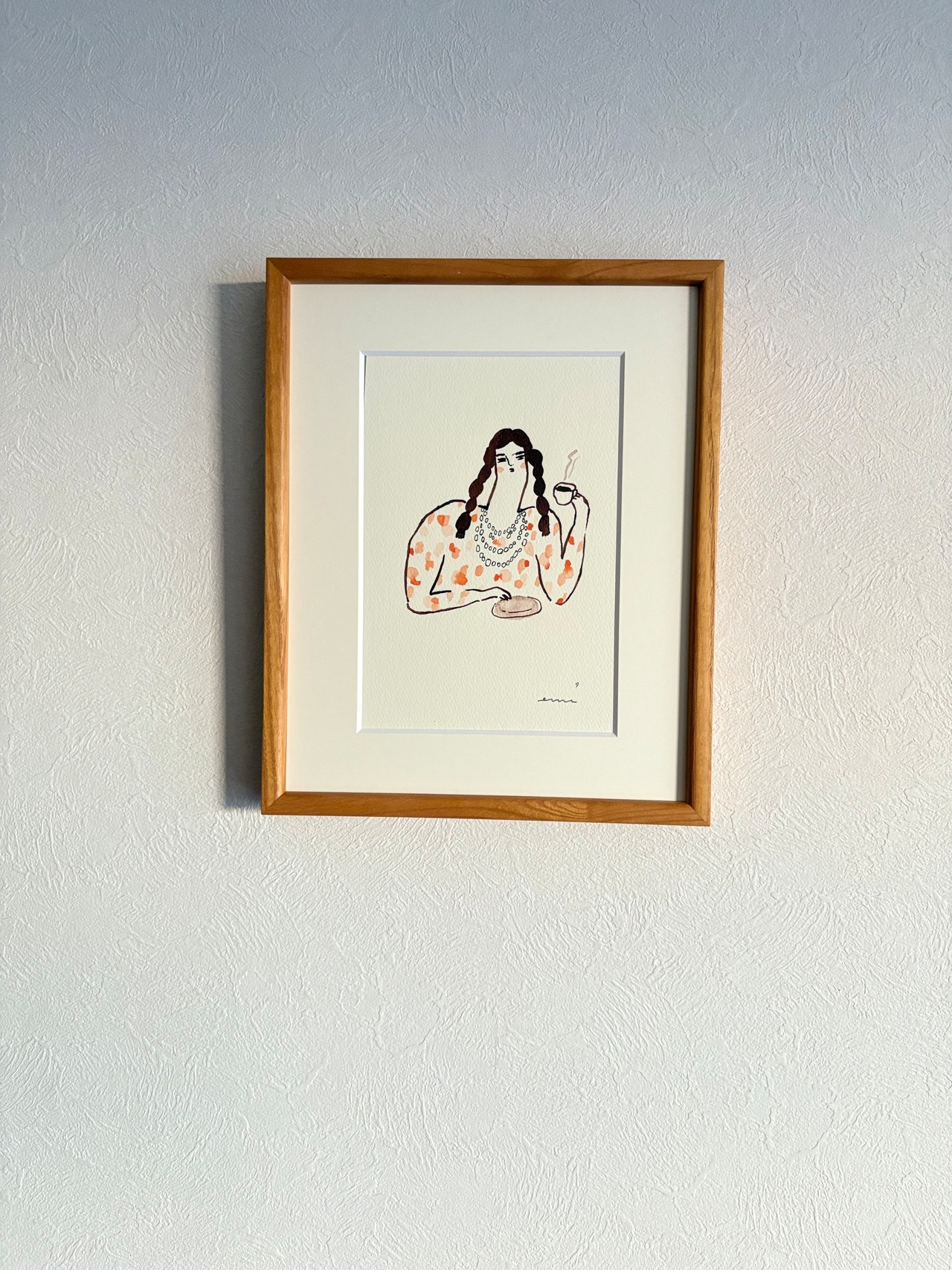 コーヒーを片手に、ゆったりと過ごすひとときを描いたイラストアートです。